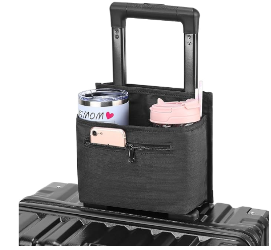 GAME CHANGER!! Luggage Travel Cup Holder Attachment for Suitcase -holds your phone and has a zip compartment to hold ticket, passport and a few dollars!! https://amzn.to/4nIv0TQ